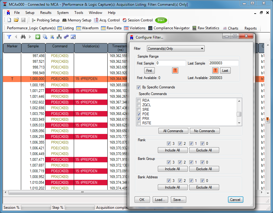 State capture results include continuous traffic around one or more events of interest. The traffic – consisting of time, bus commands, bus addressing, margin violations, and trigger events – is presented in listing or waveform displays. State capture depths from one hundred samples to one billion samples is available. Advanced acquisition controls monitor and respond to the continuous traffic in real-time to best utilize the state capture memory. Advanced post-capture search and filter can quickly parse the acquisition store.