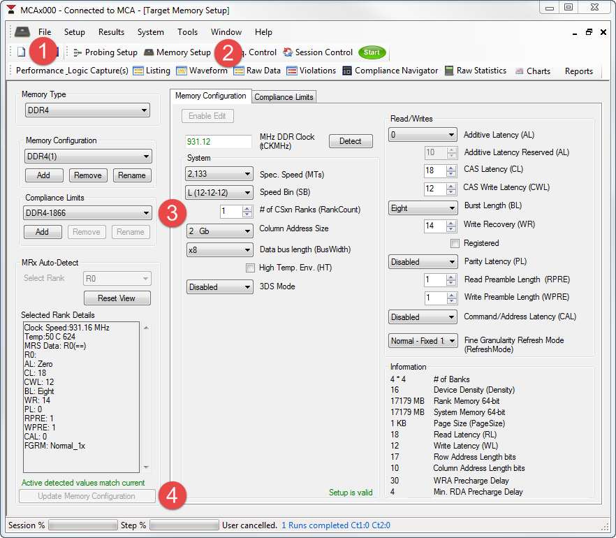 From first starting the software there are five easy steps to start gathering data. First click the New icon (1) and select the system file for the interposer/probe you are using. Next reset your target to ensure MRS data is sent. The analyzer will automatically acquire this information! Now click the Memory Setup button (2) to display the setup window. Then select the correct speed bin, rank count, and density (3). Last, click the Update Memory Configuration button (4) to apply the MRS data to the analyzer’s setup. That’s it. You are ready to start analyzing data!