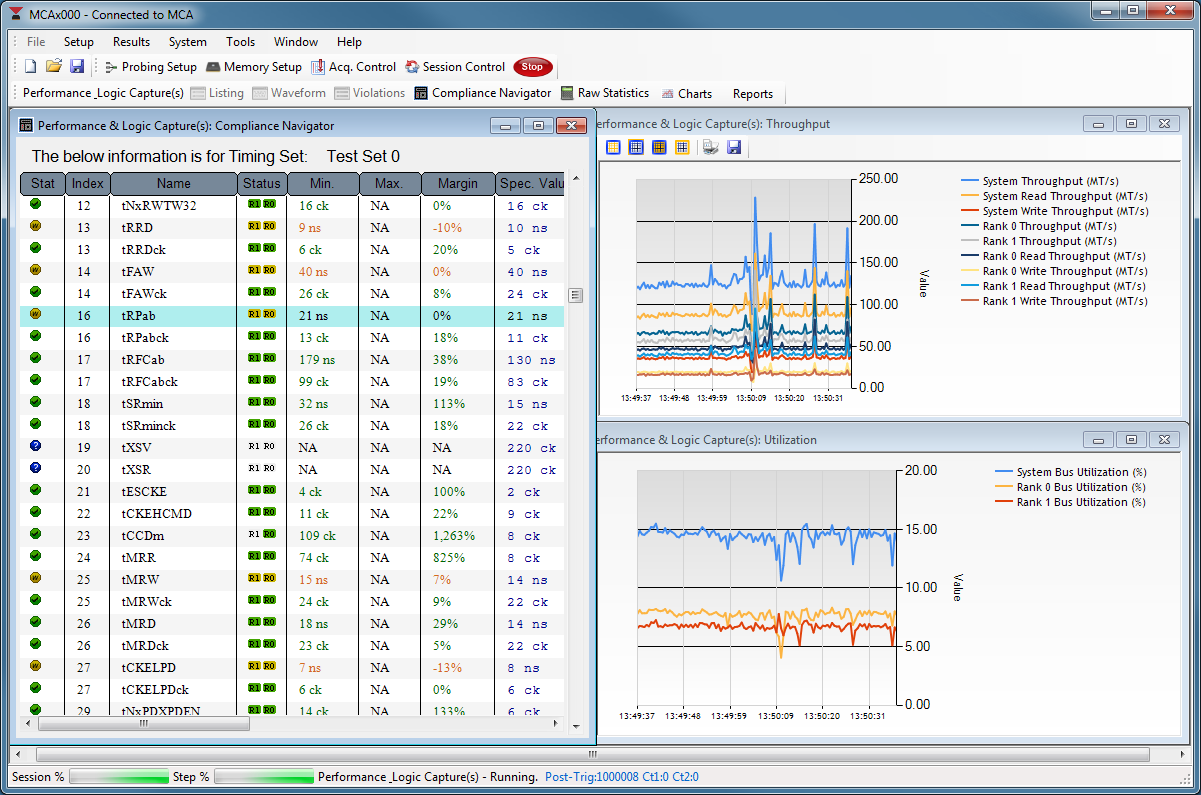 Memory performance metrics include real-time margin metrics and margin violations. For each margin test, results indicate test coverage, observed margin values, as well as flags indicating margin violations. All data is continuously acquired in real-time with results updates continuously while the analyzer is still running. Memory performance metrics also include continuous real-time charting of bus performance characteristics such as throughput, utilization, power management, and more.