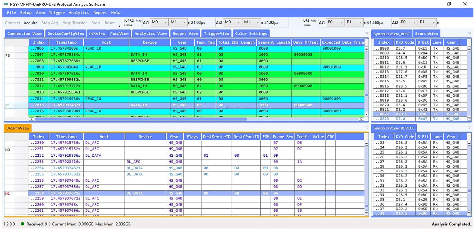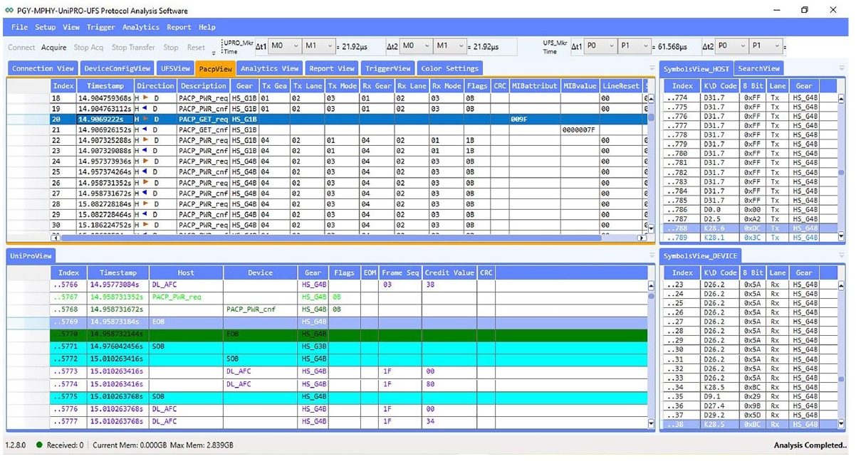 PGY-UFS3.X-PA Software separates the PACP packets in a separate view for easy analysis of power mode change packets and link to UniPro packets. Users can view the MPHY states stall, prepare, sync information in UniPro view apart from user selection for L_Data and AFC/NACK Packet details.