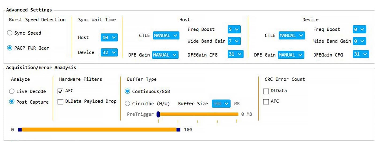 PGY-UFS3.X provides flexibility the set TX and RX CTLE and DFE equalizer to address reflection and poor SI signals while probing the MPHY signals. This helps in reducing the error decoding of packets. Newly introduced hardware based circular buffer provides the flexibility to continuously capture the protocol data and analyze the data in circular buffer size. User can set trigger on circular buffer and capture the protocol data at specific events.
