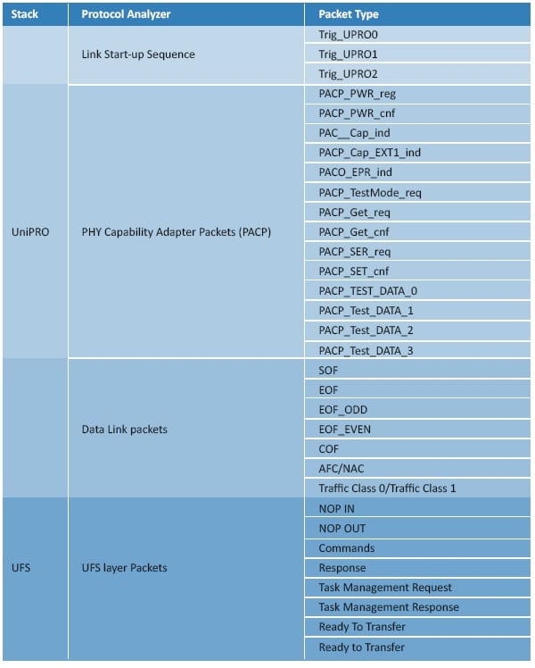 - Trigger based on MPHY, UniPro, UFS layer packet content